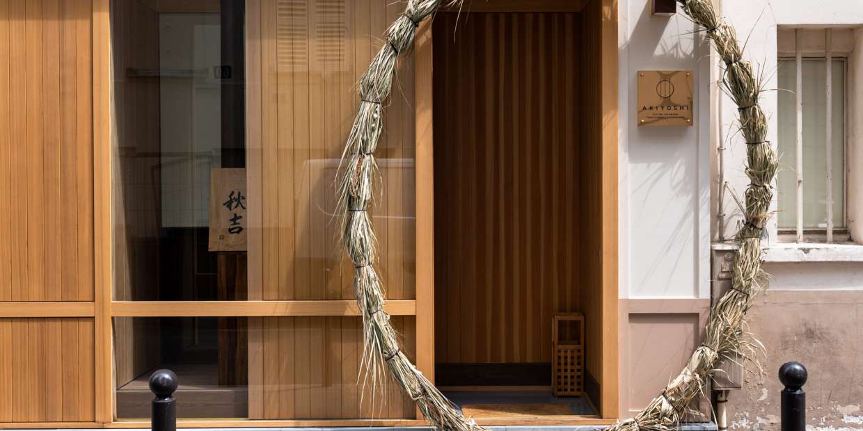 パリの6月吉日、清々しい晴天。エッフェル塔のお膝元、ユネスコ本部にもほど近い15区の静かな住宅街に『茶懐石 秋吉』を訪ねた。杉の木を張った清新な外観の玄関口には、夏越の祓(なごしのはらえ)のための茅の輪が据えてある。