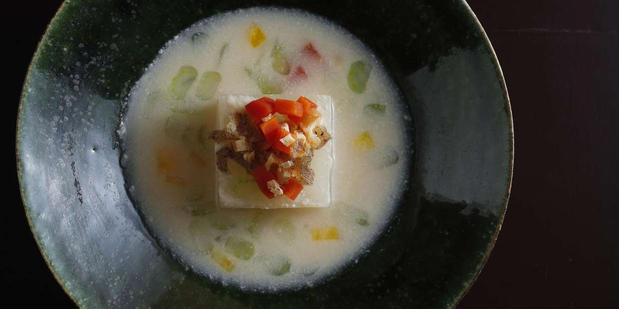 聖護院大根で作られた“食べられる枡”に盛られているのは、細かく刻んだ金時人参やコンニャク。京都・室町夷川『京夕け 善哉(きょうゆうけ よきかな)』の笹井喜晃さんが考案したユニークな大根料理は、冬の京都でお馴染みの粕汁がベース。寒さが厳しい1月に相応しい、芯から身体が温まる優しい味わいです。