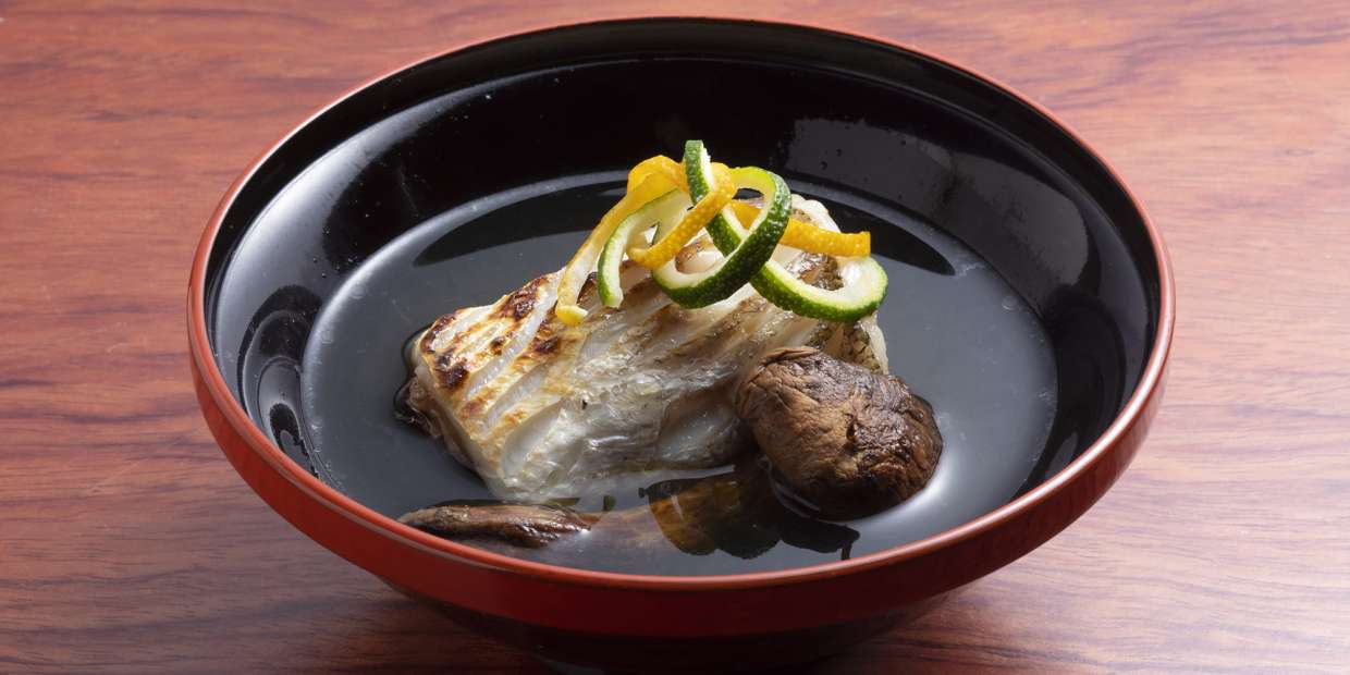 「“干す”というひと手間により、松茸らしさをより引き立たせたい」と言う、大阪『キュイジーヌ・ド・オオサカ・リョウ』の店主・畑島 亮さん。大阪料理と串揚げを看板に掲げるこちらでは、この時季、鱧松の串揚げが定番となるが、今回はあえてその人気作を封印。干し松茸でだしを引いて椀物に。香り豊かな吸地と合わせた椀種とは? 畑島さんのクリエーションが光ります。