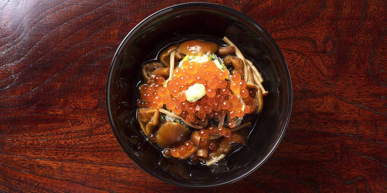 自家製のイクラ塩漬けが贅沢に盛られた、華のあるビジュアル。京都・祇園『杢兵衛』4代目の寺田慎太郎さんが今回考案した締めの新作は、10年以上前からの隠れ名物「焼きおにぎりのだし茶漬け」の秋味バージョンです。こう見えて、味の要はグジ。そこにカブ菜漬けを合わせ、原木ナメコとカキノキダケのキノコだしをかけた、要素満載の複雑な構成。料理名からはちょっと想像つかない美味しいギャップもポイントです。