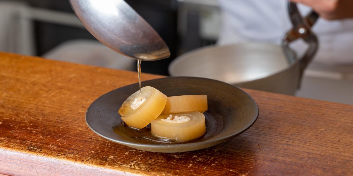 「冬大根の甘く柔らかな特徴を生かして、一品料理や八寸、椀種にも使える“砧巻き”にしました」と橘さん。桂剥きにして蒸し上げた大根を何層にも巻いてミルフィーユ状にした大根のとろけるような食感、大根の甘みと穴子の旨みが渾然一体になった深い滋味に驚かされる。「煮穴子のほかに針ショウガや京にんじんを挟んでも美味しくできますが、今回はあくまで大根が主役。冬大根の美味しさをストレートに味わえるようシンプルに仕上げました。煮穴子の代わりに、身欠きニシン(ニシンの干物)などを巻いてもいいですね」。店ではこのまま冷製または温製の小鉢で。また、季節の八寸に盛り込むことも。春菊と一緒に炊合せにするのもおすすめだ。