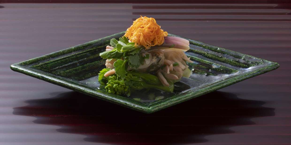 先付を選んだ理由はもう一つ、とある器の存在だ。「菱餅を意識した、3月しか使わない樂焼の菱形向付があるんです。通常はお造りを盛っていますが、サイズ的に先付に使うのもインパクトがあっていいなと閃きまして」。
