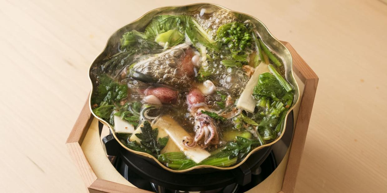 この鍋の真髄は、筍を炊いた「煮汁」にある。二番だしをベースにした濃いめの吸い地で筍を炊き、豊かな旨みを移す。さらに、旬のぷっくりした富山産生ホタルイカを入れることで、魚介の凝縮した風味が加わる。その深みのあるだしを山菜がしっとり纏うからこそ、美味しさも倍増。多彩な食感や苦味だけではない、山菜の豊かな風味や粘りにも改めて気づかされる。筍感を増したい場合は、姫皮を加えてもいい。