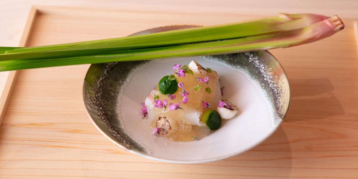 「最初、真鯛の刺身と爽やかな“菖蒲と青梅のジュレ”を合わせようと考えていましたが、下味としての香り付けに冷たい菖蒲水で“洗い”にすれば、より菖蒲のニュアンスが表現できるんじゃないかと思ったんです」と濱野紘一さん。洗いにすると魚の筋肉がキュッと収縮するために食感がよくなり、表面の余分な脂が洗われて、すっきりした後味になる。「そこに菖蒲の風味を加えることで、よりさっぱり食べられるようになります。じめじめした梅雨時や初夏にはぴったりのイメージですね」。