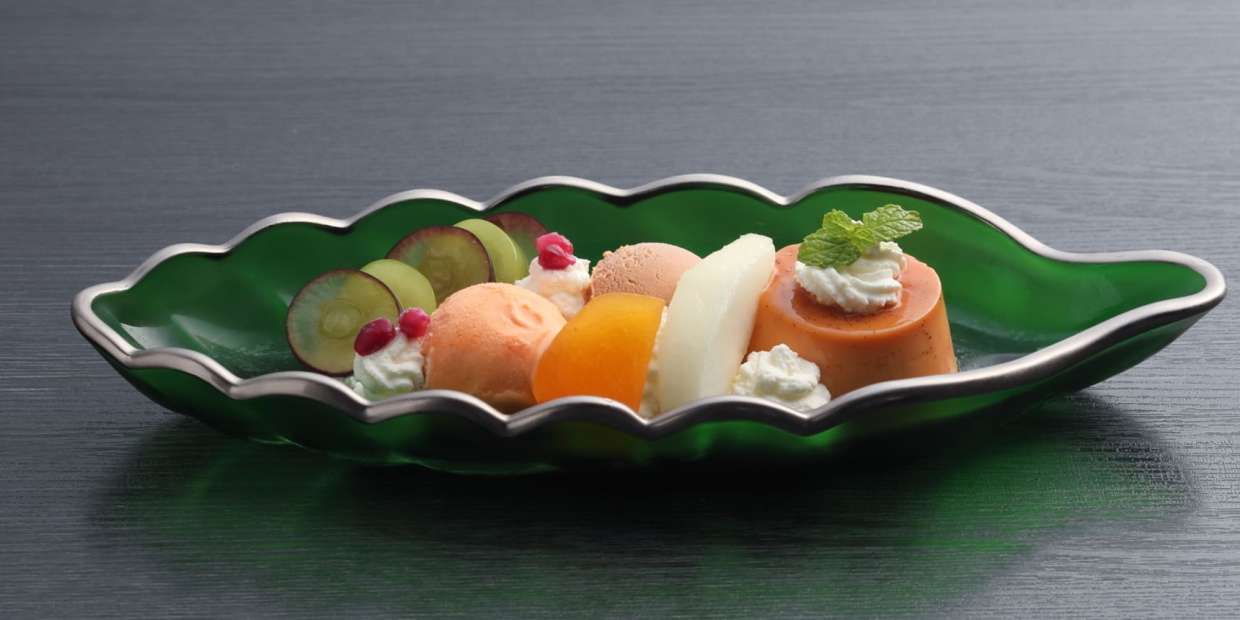 木の葉型の色ガラス皿に並ぶのは、昔懐かしいプリンやアイス、季節の果物。『京料理 清和荘』三代目の竹中徹男さんがコース料理の締め括りに供するデザートの定番の一つは、意外にもプリン・ア・ラ・モードでした。馴染みある洋菓子を盛り込んだ仕立ては、30年を超える長い経験から得た考えがあってのこと。盛り付けにも、さりげない意図が込められています。