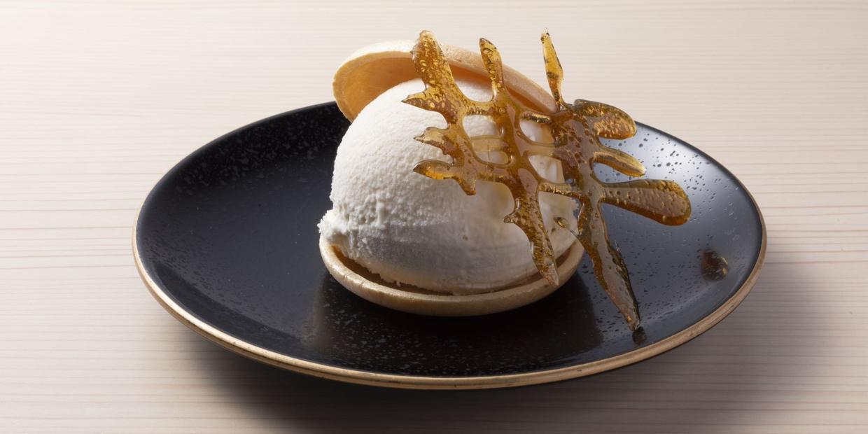 今では、季節のフルーツを用いたものから、ゴボウや白味噌、本ワサビの鮮烈な香りを生かしたものまで、素材感がみなぎるアイスが常時5種程度。なかでも、「みむろ杉」が主役のアイスには、締めでありながら“飲ませる”工夫が見え隠れする。