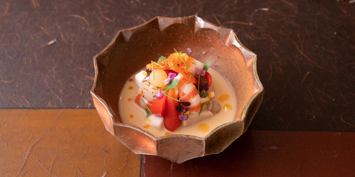 エビや焼き霜にした帆立貝柱、冬野菜、トマトなどをバランスよく盛り込んだ華やかな一品は、エビの頭と殻からとった濃厚なエビだしがまとめ役。ココナッツミルクと白味噌を加えることで、上品でまろやかな地となり、新たな感性の和食を創り上げる。