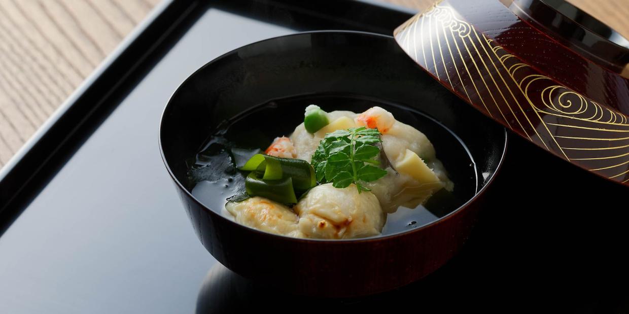 「春に欠かせない食材と言えば筍。定番の若竹煮や木ノ芽焼きもいいですが、真丈椀に仕立てることで、異なる趣を楽しんでいただけます」と岩崎さん。真丈を作るにあたって大切にしているのは、季節感に加え、味と食感のコントラストだと話す。