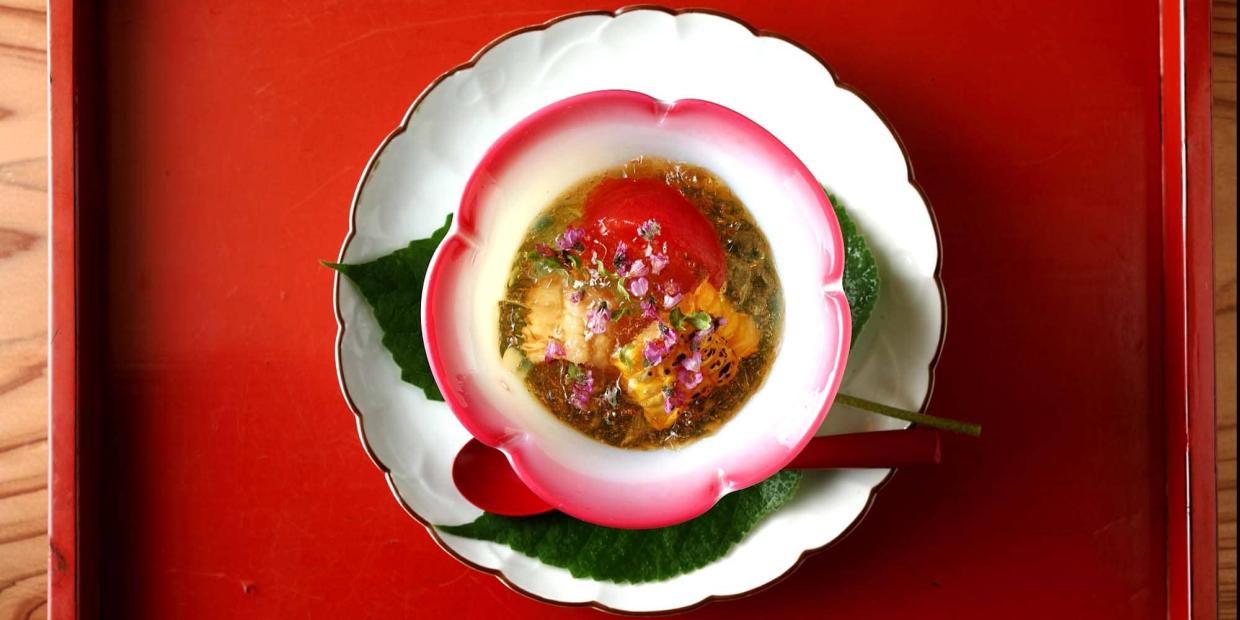 輪花皿の中には、鱧にトマト、トウモロコシと、これからが旬の食材がズラリ。その上にかかった薄黄色のジュレは、なんと自家製のパイナップル酢を固めたもので、底には土佐酢のジュレが潜んでいます。京都・二条城近くの『日本料理と日本酒 惠史(さとし)』店主・保科知史(さとし)さんが考案した酢の物は、具材の下味にも酢を使ってひと工夫。酢の味わいを巧みに重ねた仕立てがポイントです。