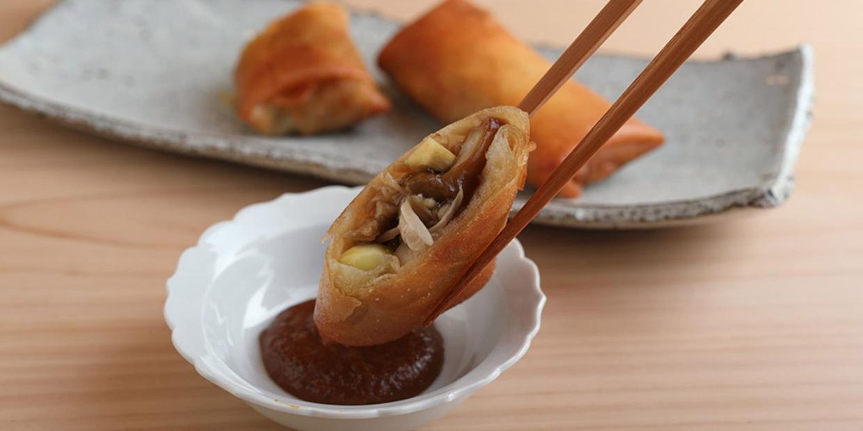 春巻に仕立てることにしたのは、ナメコ独特の粘りがいわゆる“あん”らしいニュアンスになって面白いかなという発想から。加えて「春巻にすることでキノコから出る水分を逃さず、ジューシーに仕上げられる。衣や皮で包む揚げ物は、ある意味“蒸し料理”ですからね」と利を語る。