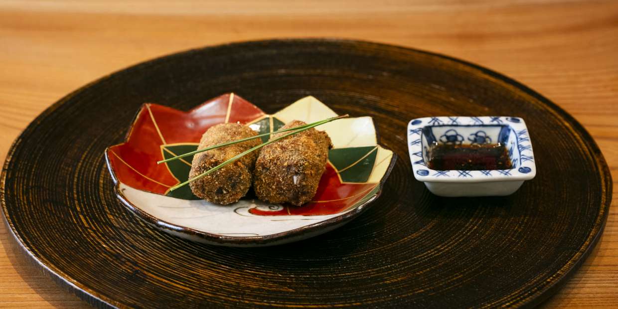茶道の主客相互の心得を屋号に冠する『麻布 和敬』。“時代を超えても色褪せない、現代の日本料理”を志す、店主の竹村竜二さんが繰り出す料理は、明快な理論と美味しい料理を作りたいという熱意に支えられています。今回の「香茸のコロッケ」は、松茸以上といわれる貴重な天然キノコ・香茸の独特の風味を衣の中に閉じ込めた一品。バターや生クリームを使いながらも和の仕立てを大切に、自家製山椒ソースでコクと旨みをプラスする隠し技にも注目です。
