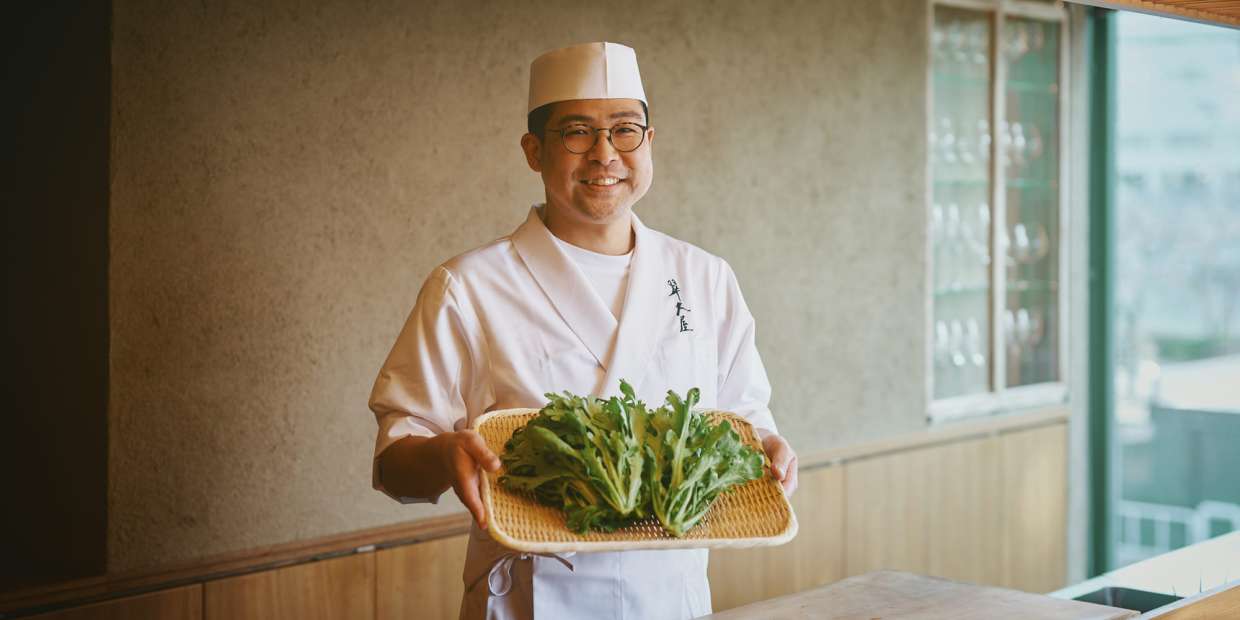 大阪産(もん)の魅力をお伝えするレシピ記事Vol.3は、大阪の「泉州きくな」がテーマです。今回、産地訪問を経て2品の料理を考案してくれるのは、浪速割烹の流れを汲む料理人『翠(すい) 大屋』の大屋友和さん。一つは、フレッシュな菊菜の個性を生かした和え物を。もう一品は、葉はもちろん、根元部分も余すところなく用いた真薯椀です。この日は生産者である『西阪農園』西阪和正さんも「どんな料理になるのか楽しみで」と訪れました。素材感が漲(みなぎ)り、かつ創意に富んだ料理を試食していただきました。