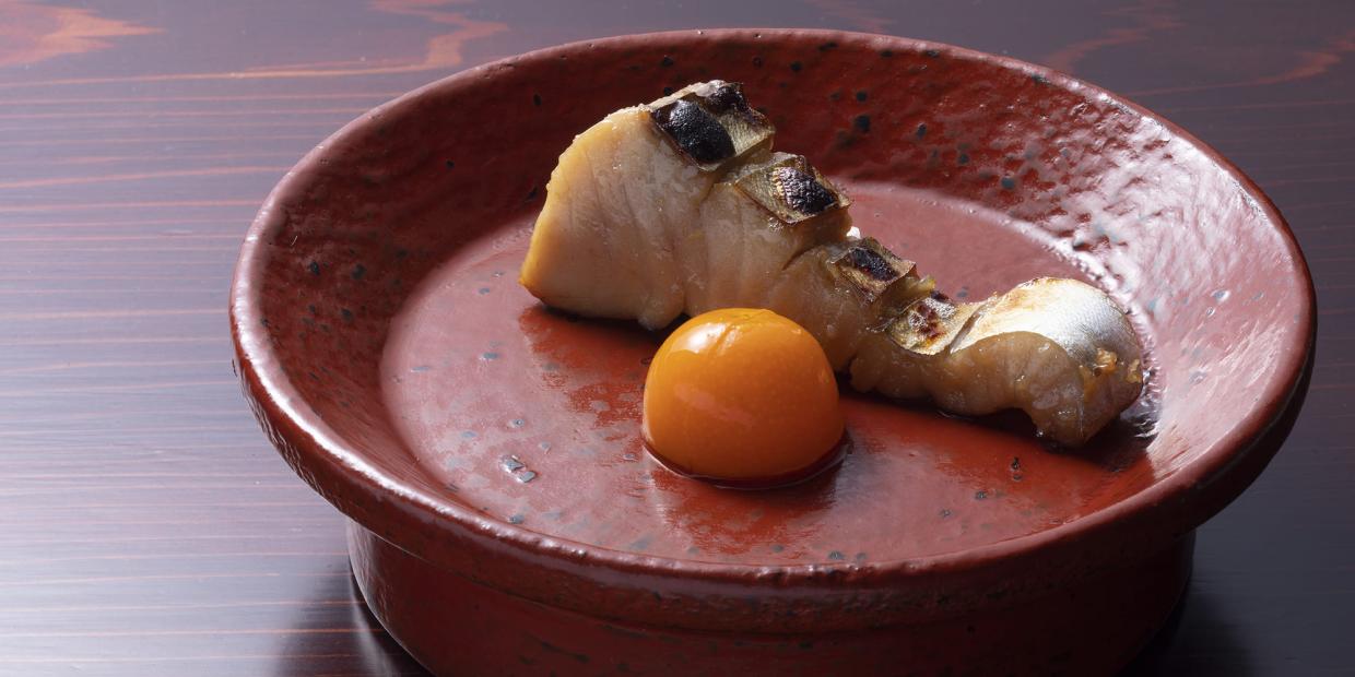 秋から冬にかけてはサワラや金目鯛、春から初秋にかけてはマナガツオを用いることが多い。「味噌幽庵焼きといえば、の魚種ですが、脂のりが抜群の素材が手に入った時に限り」、コースの焼物に組み込む。