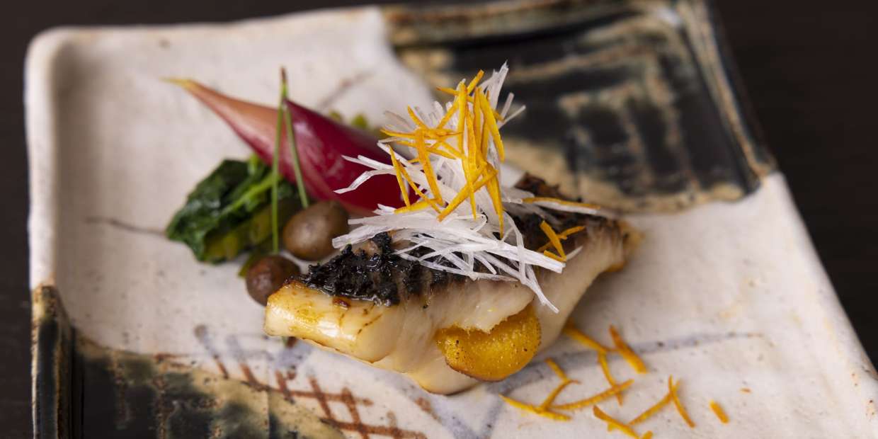 【レシピ付き】魚の味噌幽庵焼き Vol.2 東京『日本料理 初志』の「ボラとカラスミの腹子焼き ブラッドオレンジ味噌幽庵」