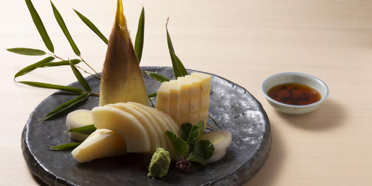 皮が白っぽくて、切り口は真っ白。大阪・木積(こつみ)の『王子春星園(おうじしゅんせいえん)』で採れた「白子たけのこ」が手に入った時のみ作ったという上野修三さんの名作を再現。