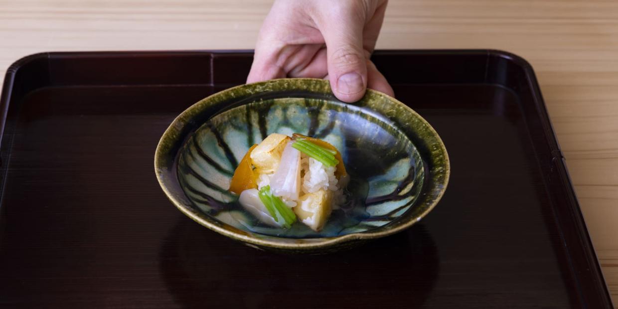 今年3月に開店4年目を迎えた『赤坂 おぎ乃』。主人の荻野聡士さんが凛として立つ、白木のカウンターは活気に満ち、連日予約で埋まっています。春の献立に欠かせない筍は、オリジナリティを加味し、美しく香り高い料理に。今回ご披露いただく「筍の飯蒸し」も食感のいい揚げ筍と温かな飯蒸し、カラスミの塩味が奥深い味を醸し出す一品です。