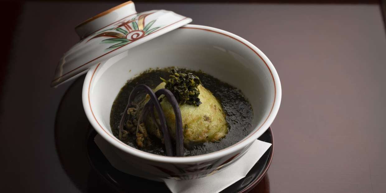空豆生地の中には鹿肉の山椒煮や毛ガニを仕込んで上品なコクをプラス。ワカメ餡と取合せ、海と山の素材らしさを大切に、重たさを感じさせない椀物に仕立てる。