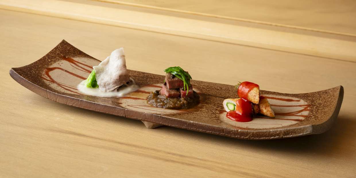 開店以来、歴代の料理長がそれぞれの個性を花開かせてきた『銀座 奥田』。2022年に料理長に就任した飯塚栄二さんもまた、師匠である『銀座 小十』の奥田 透さんの元で長年腕を磨いた実力の持ち主です。今回、飯塚さんが作ったのは、“野菜あん”を使った料理3種。新玉ネギ、新ゴボウ、赤パプリカといった野菜の色合いや持ち味を生かし、相性のいい3種の肉と合わせて盛り込んだ意欲的な一品です。