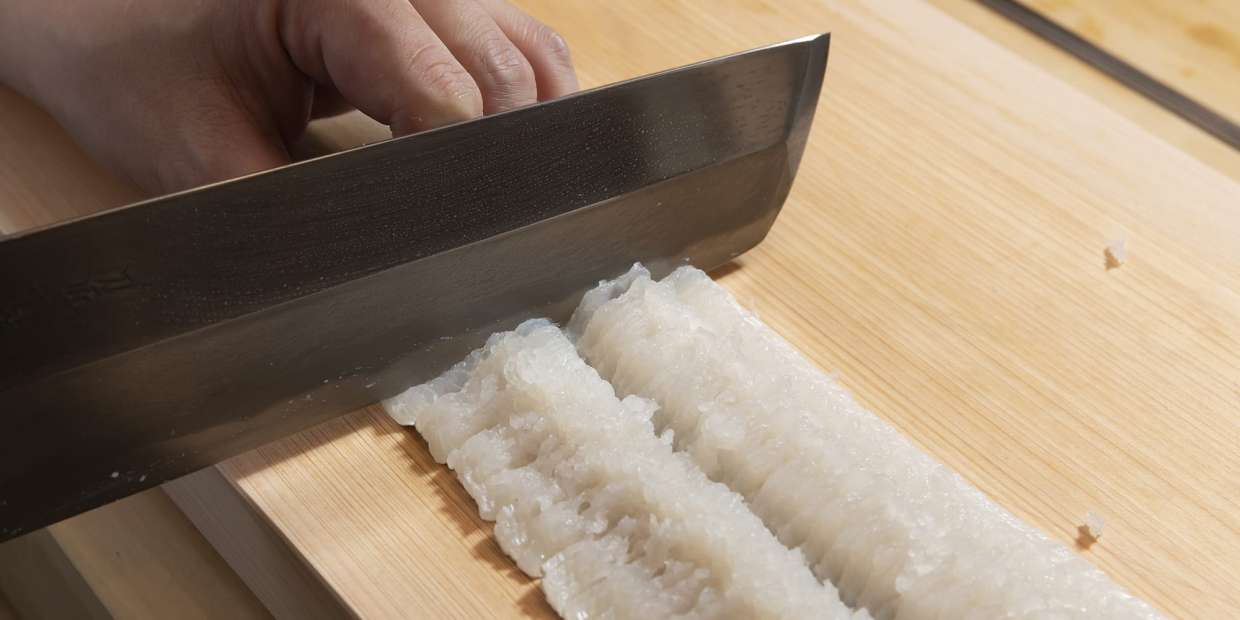 鱧の香り、旨みを保持するため真空状態で皮霜にした後、1㎜幅のそぎ造りに。水、ハチミツ、梅酢を加えた氷水で洗いにすると、皮はコリッ、身はプルンとした食感。ほんのり甘酸っぱい風味で夏向きの造りとなる。塩やスダチ、ワサビを添えて。