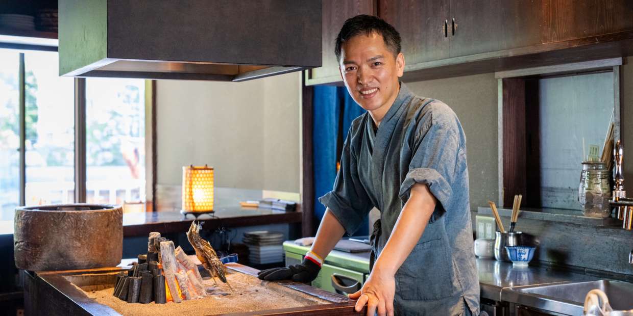 鮎の提供は6月から11月前半まで。寒い時季には網捕りの鴨、猪、蝦夷鹿などジビエの炭火焼きが主役になります。春は山菜や筍、天然ヤマメ、月の輪熊と花山椒のしゃぶしゃぶ、すっぽんなどをお出ししたら、鮎が始まるまで3週間ほど休みを取ります。野趣に富んだ天然素材が手に入らない時季に頑張っても仕方がないので、鮎が始まるまで十分に英気を養います。