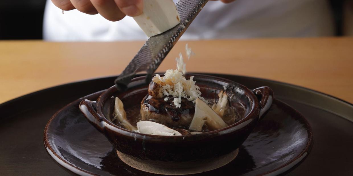 小さな土鍋の中で松茸に囲まれて煮えているのは、ミニサイズのハンバーグ。レンコンのシャキシャキとした食感と、後からふわりと漂う山椒の香りが印象的です。今回牛肉料理を提案いただいたのは、京都・烏丸五条『よこい』店主の横井裕史さん。あくまで和の一品になるよう構築したハンバーグは、さりげない工夫が満載です。