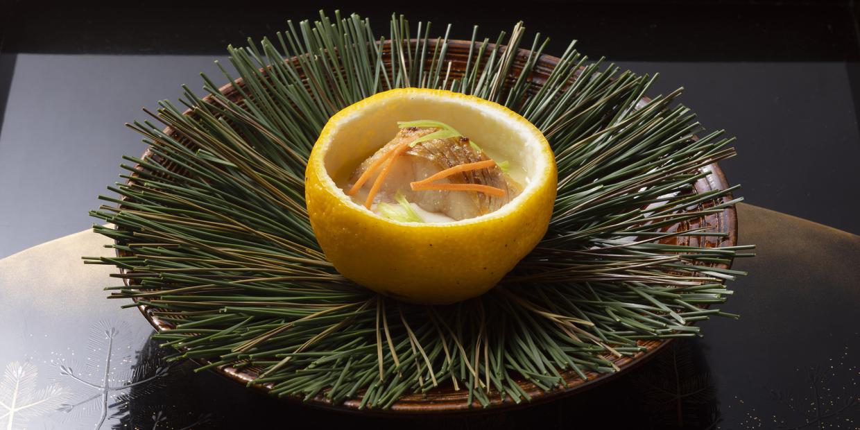大阪・東心斎橋にある割烹『翠 岡﨑』。「日本料理の伝統と少しの驚き、その調和を大切にしたいです」。そう話す店主の岡﨑直哉さんが冬の先付で心がけたのは「インパクトと、ほっとする味を両立させること」。見るからに芳しい柚子釜の中には、厚みのある白甘鯛。なめらかな百合根(ユリネ)生地や、とろみを利かせた白菜のすり流しが層を成す、コントラストが印象的な一品です。
