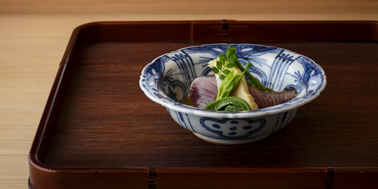 東京・麻布『東麻布 いち川』市川達也さん作 鰹と筍、山菜の木の芽黄身醤油