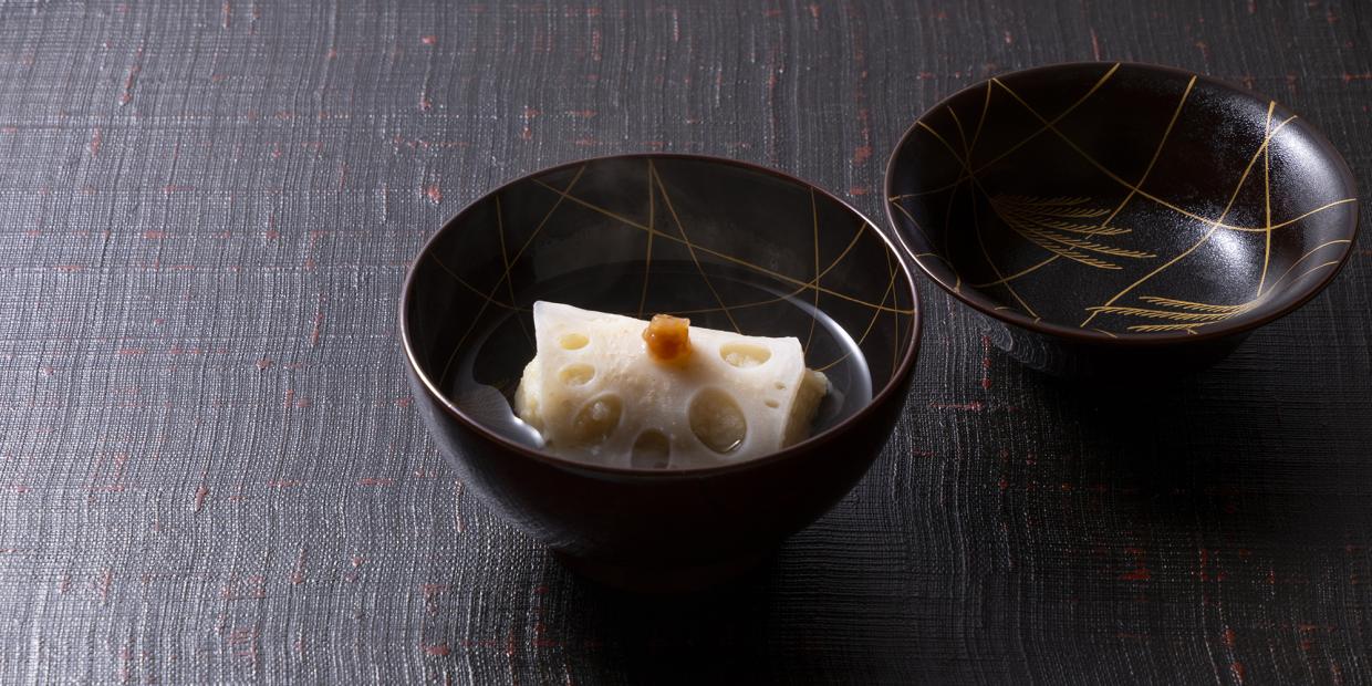 レンコンはシャキシャキ感と甘み、粘りが強い2節目を使用。すりおろしたレンコンに万願寺味噌を合わせて輪切りを重ね、蒸し上げたものを器に盛り、だしを張る。いただくと、レンコンの異なる食感が楽しく、その滋味とだしが体に染み入るよう。初秋の訪れを告げる、心あたたまるひと品だ。