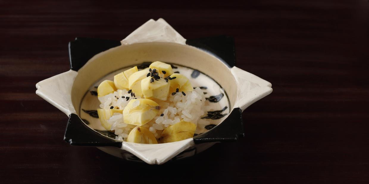 今回紹介する「丹波栗の飯蒸し」は、『祇園 川上』で供される「白小豆の飯蒸し」のレシピを応用した料理で、質実な味わいの中に独自の進化を感じさせる。提供するのは9月から11月にかけて。コース中盤、アラ焚きや焼き物、煮付けなど直球で力強い料理の後、口を優しく整え、季節を伝える役目を果たす。 仕立ては極めてシンプルで端正。調理の一つ一つを見直して丁寧に磨き上げ、栗名月を象徴する逸品へと昇華している。