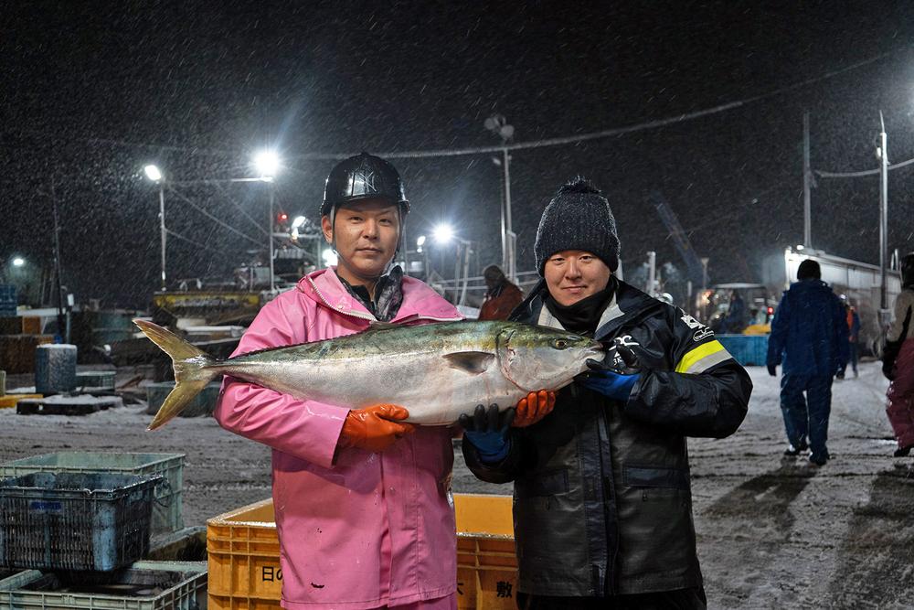 「日の出大敷」網元の中田洋助さん(左)と『花紫』料理長の中村雅和さん(右)。この日、中村さんは漁船に乗って漁の現場を見学。今回の新作メニューについて共有し、この寒ブリを仕入れた。