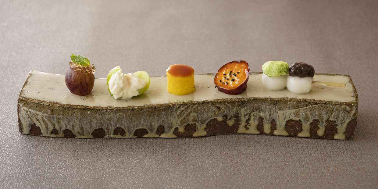 松茸にはまだ早く、これぞ主役という旬素材がない9月も、5月と並んで献立が難しい月。『銀座 小十』の奥田 透さんは前年、そのまた前の年に仕立てた料理を封印するということを自らに課しているため、献立の難易度は年々上がるばかりです。ここ数年、大好評だったにもかかわらず、八寸で美しい“秋の演出”をすることを禁じ手とした今年は、吹き寄せ的な面白味をデザートで表現。そのフィナーレへと向かう献立は、定番の牛肉料理をリニューアルし、煮物には伊勢海老で作る新作の飛竜頭が登場します。