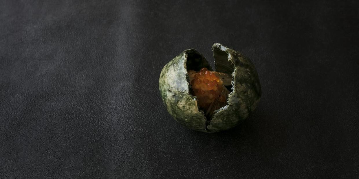めちゃくちゃ盛りにくいんですが、これ以上ないアート性を感じるうつわです。ありきたりの料理だとうつわに負けてしまいますから、カマスの炭火焼き、焼き松茸に、酢橘醤油で和えたホウレン草の軸で食感を添え、イクラおろしをのせた季節の和え物に。卵をイメージさせるこのうつわから‟何かが生まれる“イメージです。