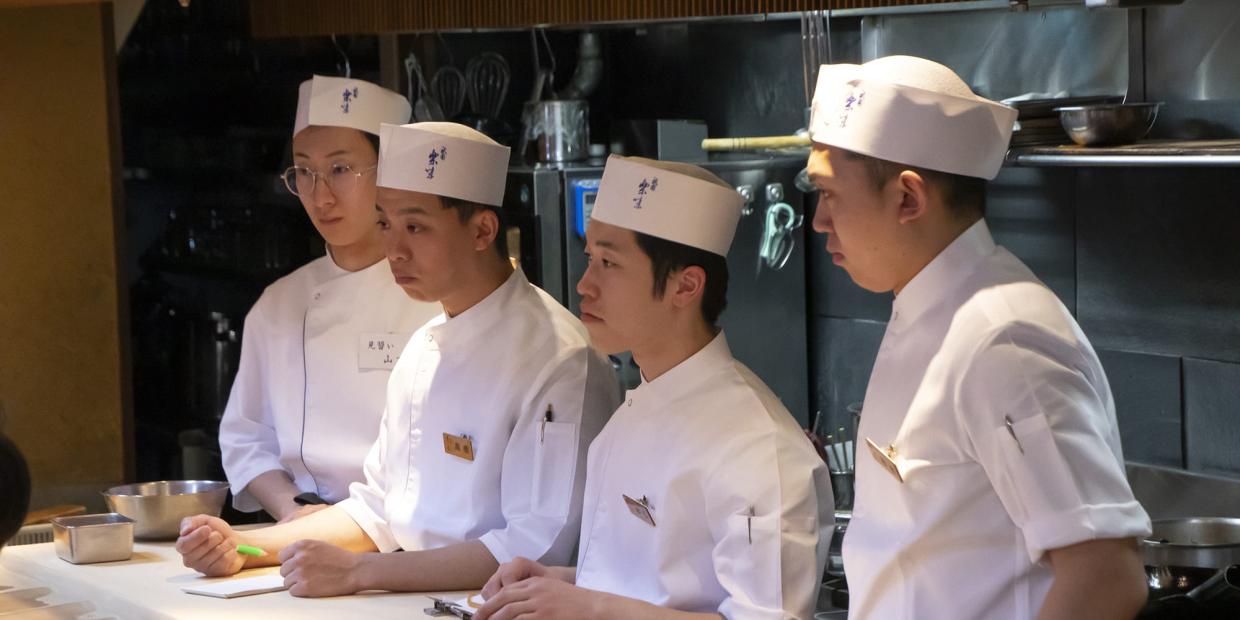 『衹園 楽味』の料理人。上左/髙橋貴明さん。2015年入店で、煮方を務める。上右/水口直規さん。2016年入店で、向板を担当。下左/焼き場の堀越優希さんは、2022年入店。下右/見習いの山下一我さんは、2024年入店。