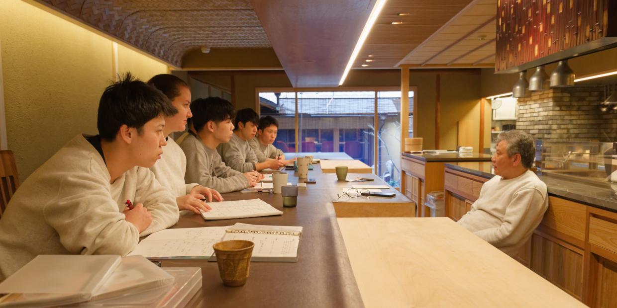 『衹園さゝ木』の献立会議:2023年、リニューアルを経てコンセプトを「弟子と挑む味づくり」に。調理スタッフと共にアイデアを出し合い、若い感性と佐々木さんの経験値を掛け合わせ、献立を組み立てる。夜のコースは基本的に、先付、前菜、椀、向付2品、鮨2カン、焼き物、進肴(すすめざかな)、鉢物、ご飯物、デザート。昼のコースは夜のメニューを取り入れつつ、料理6品、ご飯、デザートで構成する。献立会議を経た後、すべての料理を試作し、改めて試食会でサービススタッフや姉妹店『衹園 楽味』のスタッフが試食、最終チェック。料理内容は、その都度、修正・改良が加えられる。