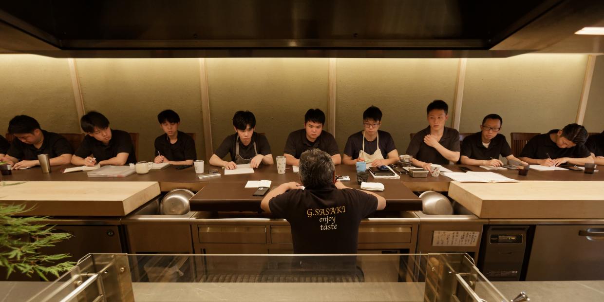 『衹園さゝ木』の献立会議:2023年、リニューアルを経てコンセプトを「師弟で挑む味づくり」に。調理スタッフと共にアイデアを出し合い、若い感性と佐々木さんの経験値を掛け合わせ、献立を組み立てる。夜のコースは基本的に、先付、前菜、椀、向付2品、鮨2カン、焼き物、進肴(すすめざかな)、鉢物、ご飯物、デザート。昼のコースは夜のメニューを取り入れつつ、料理6品、ご飯、デザートで構成する。献立会議を経た後、すべての料理を試作し、改めて試食会でサービススタッフや姉妹店『衹園 楽味』のスタッフが試食、最終チェック。料理内容は、その都度、修正・改良が加えられる。