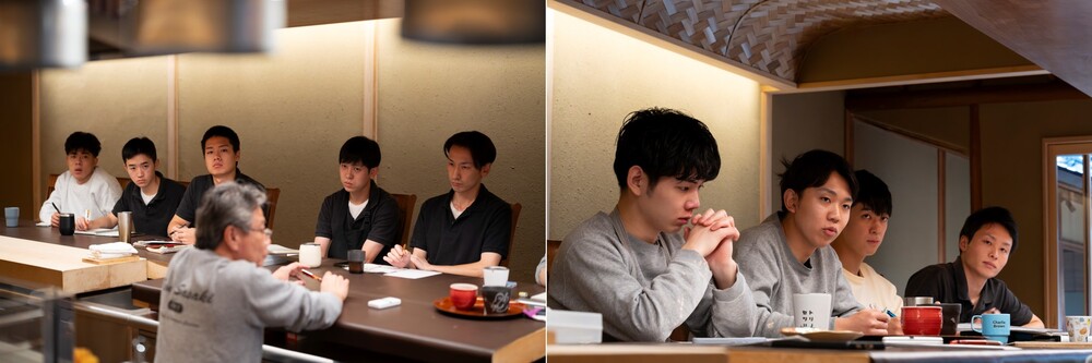 『衹園さゝ木』の献立会議:2023年、リニューアルを経てコンセプトを「師弟で挑む味づくり」に。調理スタッフと共にアイデアを出し合い、若い感性と佐々木さんの経験値を掛け合わせ、献立を組み立てる。夜のコースは基本的に、先付、前菜、椀、向付2品、鮨2カン、焼き物、進肴(すすめざかな)、鉢物、ご飯物、デザート。昼のコースは夜のメニューを取り入れつつ、料理6品、ご飯、デザートで構成する。献立会議を経た後、すべての料理を試作し、改めて試食会でサービススタッフや姉妹店『衹園 楽味』のスタッフが試食、最終チェック。料理内容は、その都度、修正・改良が加えられる。