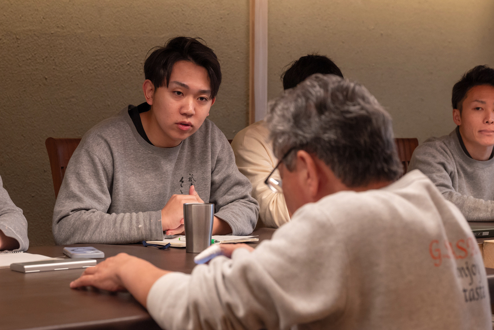 『衹園さゝ木』の献立会議:2023年、リニューアルを経てコンセプトを「師弟で挑む味づくり」に。調理スタッフと共にアイデアを出し合い、若い感性と佐々木さんの経験値を掛け合わせ、献立を組み立てる。夜のコースは基本的に、先付、前菜、椀、向付2品、鮨2カン、焼き物、進肴(すすめざかな)、鉢物、ご飯物、デザート。昼のコースは夜のメニューを取り入れつつ、料理6品、ご飯、デザートで構成する。献立会議を経た後、すべての料理を試作し、改めて試食会でサービススタッフや姉妹店『衹園 楽味』のスタッフが試食、最終チェック。料理内容は、その都度、修正・改良が加えられる。