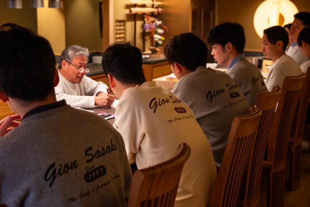 『衹園さゝ木』の献立会議:2023年、リニューアルを経てコンセプトを「師弟で挑む味づくり」に。調理スタッフと共にアイデアを出し合い、若い感性と佐々木さんの経験値を掛け合わせ、献立を組み立てる。夜のコースは基本的に、先付、前菜、椀、向付2品、鮨2カン、焼き物、進肴(すすめざかな)、鉢物、ご飯物、デザート。昼のコースは夜のメニューを取り入れつつ、料理6品、ご飯、デザートで構成する。献立会議を経た後、すべての料理を試作し、改めて試食会でサービススタッフや姉妹店『衹園 楽味』のスタッフが試食、最終チェック。料理内容は、その都度、修正・改良が加えられる。