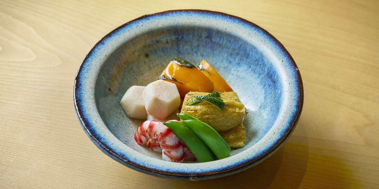 エビとスナップエンドウは塩湯がき、南京は炊いたら水くさくなるので蒸します。小芋は真水で湯がいて軟らかくしてから、煮汁を沸騰させたところに移し入れて炊きます。同じ温度帯の中で平行移動させることで食材の繊維が開いたまま、味をのせることができるんです。