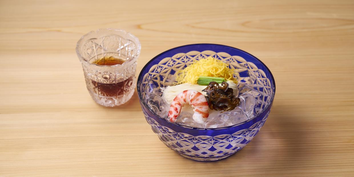 暑くて食欲が落ちる時季、コース最後のご飯代わりに提供する冷やし素麺です。『浜作』では至極シンプル、茹でた麺とつゆをお出しします。