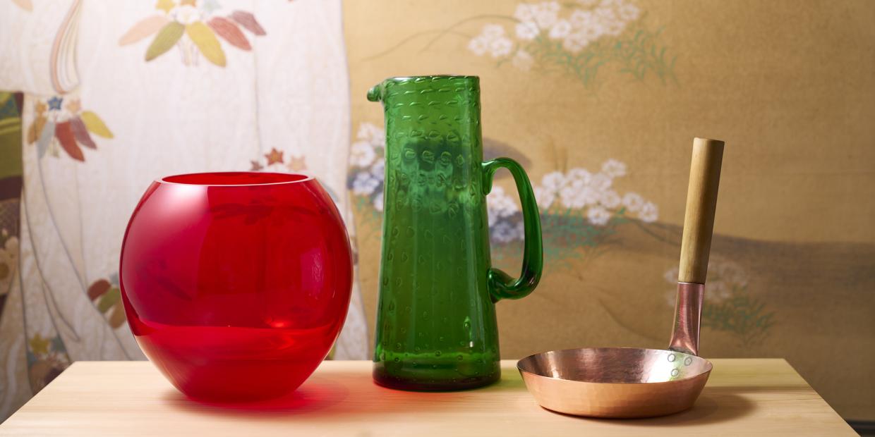 ビビッドな色合いの鉢と水差しは【料理編】「冷やし素麺」で登場したもの。そして、磨き上げられた手付き鍋は「かき揚げ天とじ丼」で、かき揚げとつゆ、溶き卵を合わせて火入れする際に使ったもの。京都『浜作』の板前で存在感を放つ、道具の話をお聞きしました。