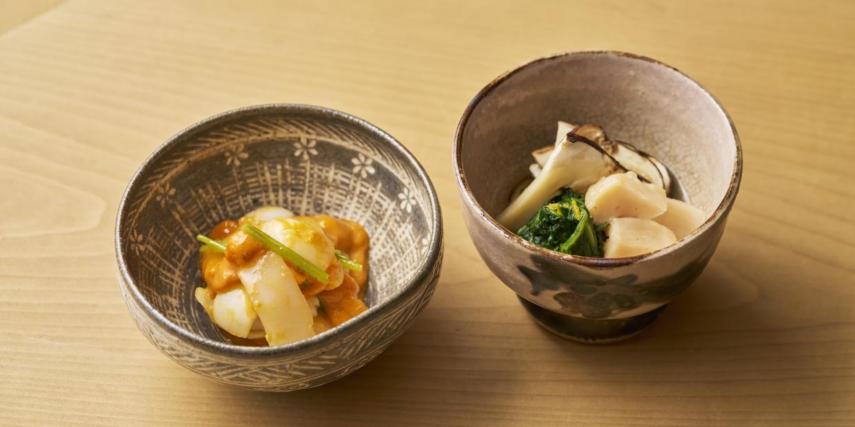 「すべての料理において食べやすいことは必要条件、その上で彩りの良さや歯応えの良さなどの十分条件が10や20と重なることで奥行きのある、完成度の高い料理ができる」と京都『浜作』の主人・森川裕之さんは語ります。その考えは和えもの、小鉢にも通底し、Vol.1では白和えとゴマ和えを通してお伝えいただきました。今回ご紹介するのは、松茸と菊葉をサッと炊いた温製のお浸しと、素材の味を活かしたウニ和えです。シンプルな調理に宿る森川さんの料理哲学にご注目ください。