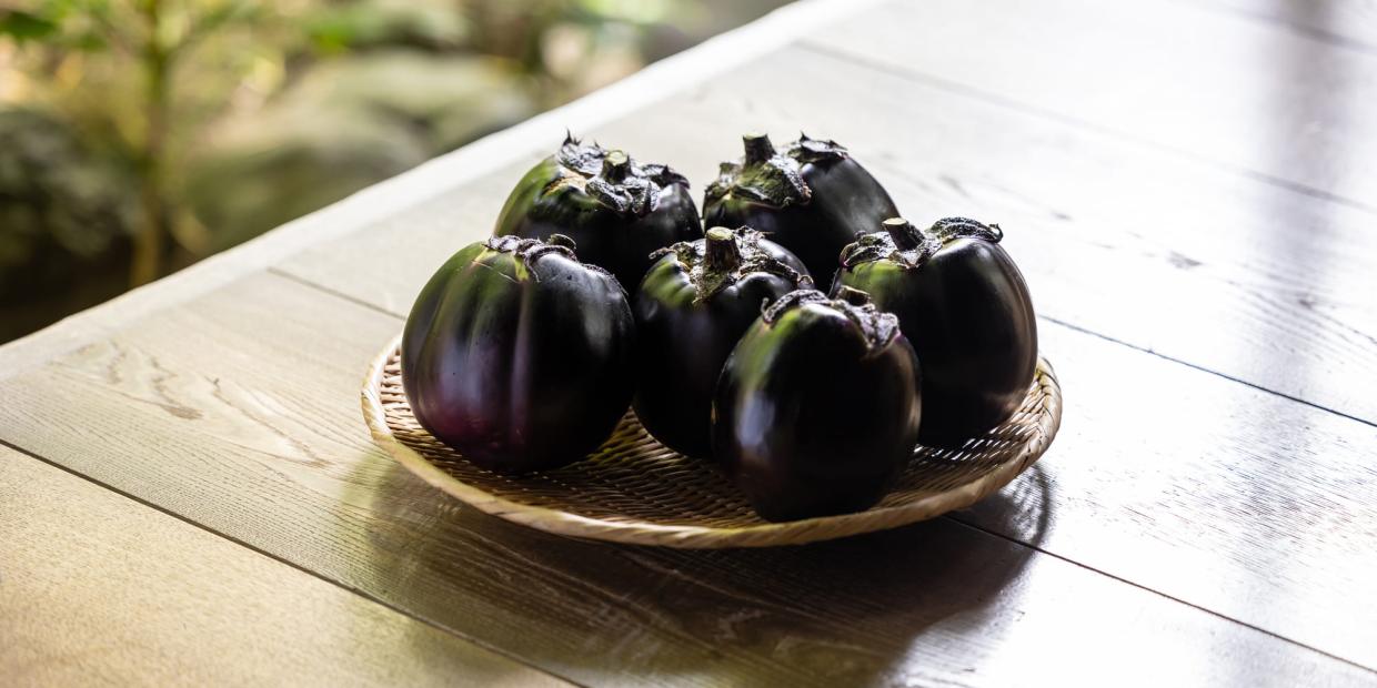 賀茂なすは、代々受け継ぐ種で有機栽培している、上賀茂の『田鶴農園』さんのものを使っています。5月後半から出始めますが、うちで使うのは6月と7月。初めのうちは特に大きく不揃いで、6月に入るとほぼほぼ揃ったものが入ってきます。採りたての新鮮な賀茂なすは色艶がよく、太陽の光をしっかり浴びて育ったものは色ムラがなく、紫紺の皮がパンと張ってきれいです。1日置くだけで劣化が始まるので、身のつまった、ずっしりと重たいものを選び、新鮮なその日のうちに使うようにしています。