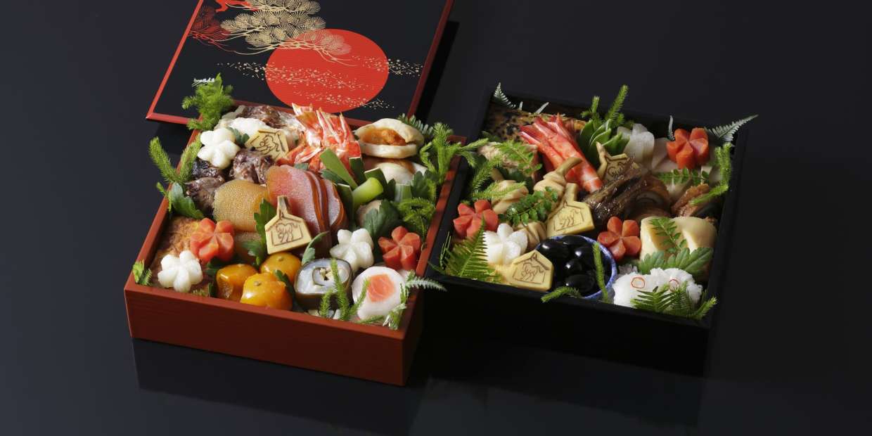 魴(マナガツオ)味噌幽庵焼き/鯛塩糀焼/ぐじうるか焼/車海老カラスミ粉焼/伊勢海老このわた焼/鶉(ウズラ)味噌漬/うなぎ八幡巻/鴨ロース/ホタテ松風/ウニ松風/鴨松風/平目求肥巻/穴子棒すし/車海老菊花すし/サーモン砧巻/菊かぶら/汐子(シオコ)粕漬/カラスミ/ぶどう豆/キンカン蜜煮/串さし生貝・チシャトウ味噌漬/竹の子/松笠慈姑/穴子鳴門巻/車海老つや煮/寄せ子/助子湯葉巻/鶴小芋/揚小巻湯葉/炊きもろこ/梅人参/梅長芋/絵馬慈姑/絹さや 等々