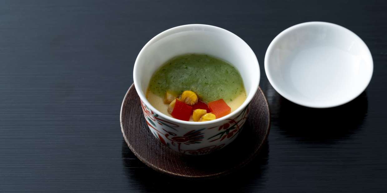 トウモロコシ料理Vol.2は、濃厚な味わいが特長の茶碗蒸し。下茹でしたトウモロコシに醤油やみりんを合わせてフライパンで焼き、「焼きトウモロコシ」のような風味を生かします。まったりした味わいに輪郭を持たせる付合せなど、『瓢亭』15代目当主・髙橋義弘さんの技が光ります。