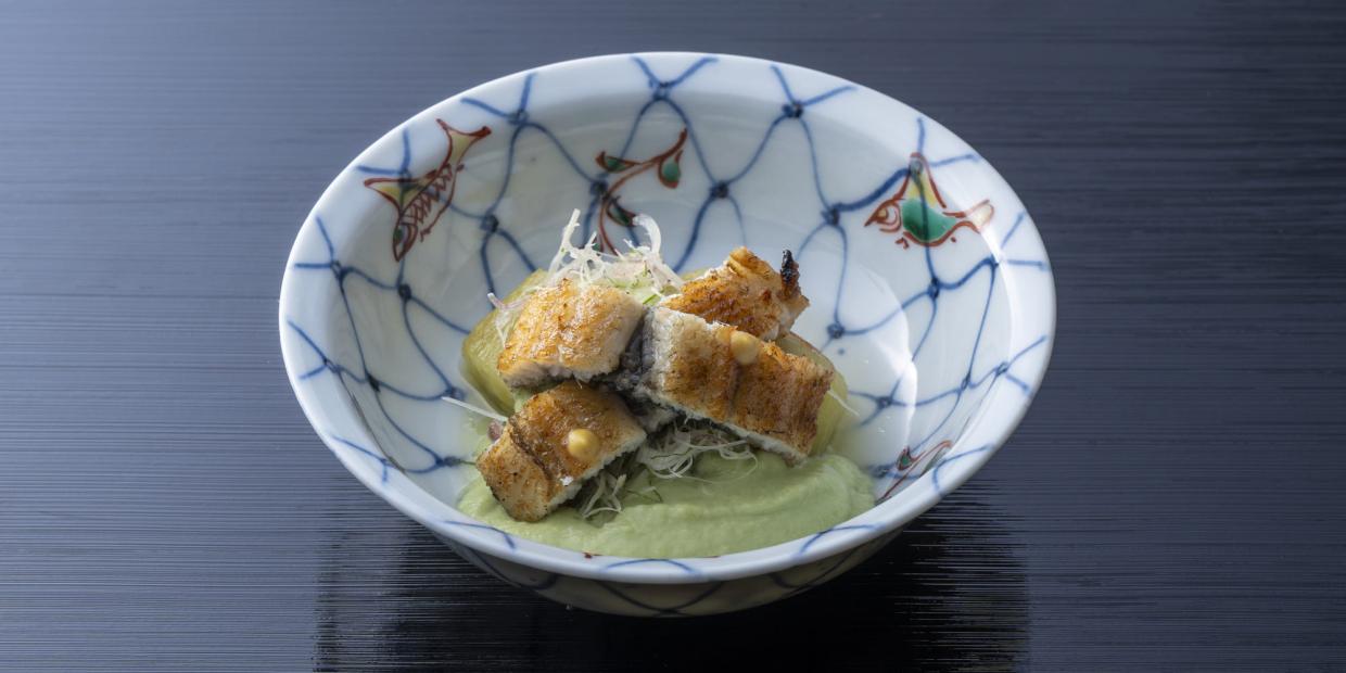 『瓢亭』15代目当主・髙橋義弘さんに教わる枝豆料理Vol.2は、濃厚な枝豆あんが主役の一品。Vol.1と同様に塩茹でした枝豆と、その茹で汁も使って仕立てます。合わせるのは、冷製の翡翠ナスと熱々に白焼きした鰻。冷温の食材にもまったりと絡み、夏らしい香りや味わいを楽しませます。