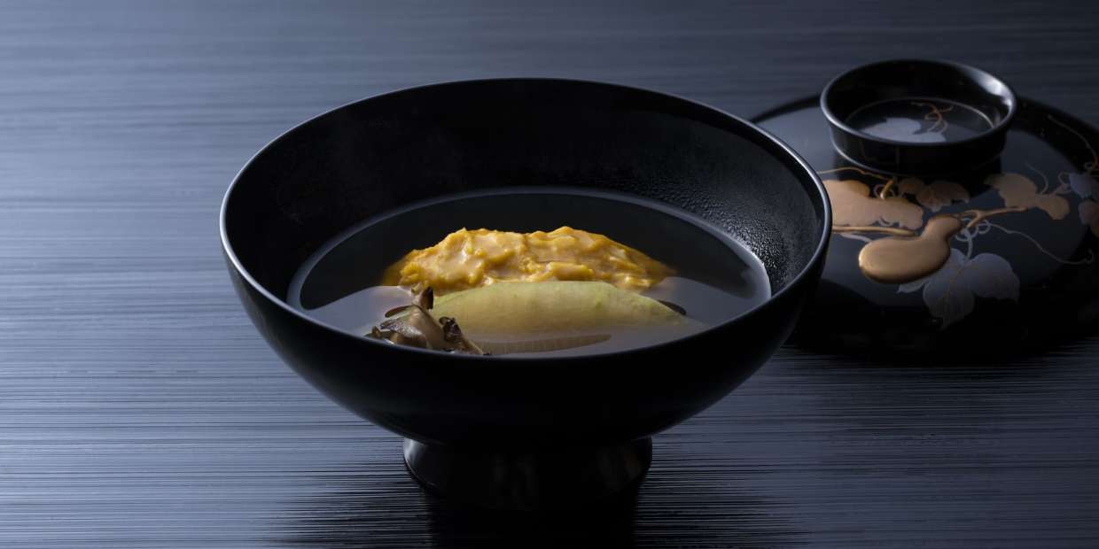 『瓢亭』15代目当主・髙橋義弘さんに教わる南瓜料理Vol.2は、カボチャを真丈にした椀。濃縮した味わいの真丈地の仕立てに技があります。吸い地にはVol.1で教わった野菜だしを使い、少量の白醤油と塩で味を調えて。付合せにはマイタケを添え、少し、秋の香りを漂わせます。