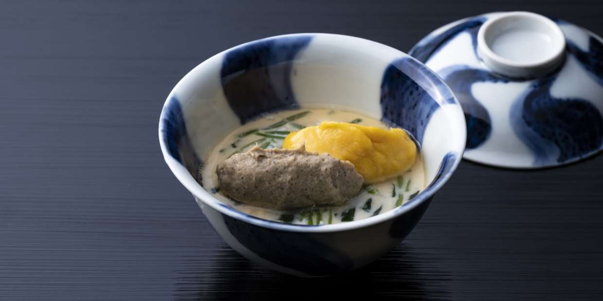 この料理はもともと、卵白で玉地を作り、卵黄を玉味噌にして共に食べる玉子料理の一つとして考えたものです。そこにキノコペーストを合わせると、季節感と複雑味が出る一品となりました。
