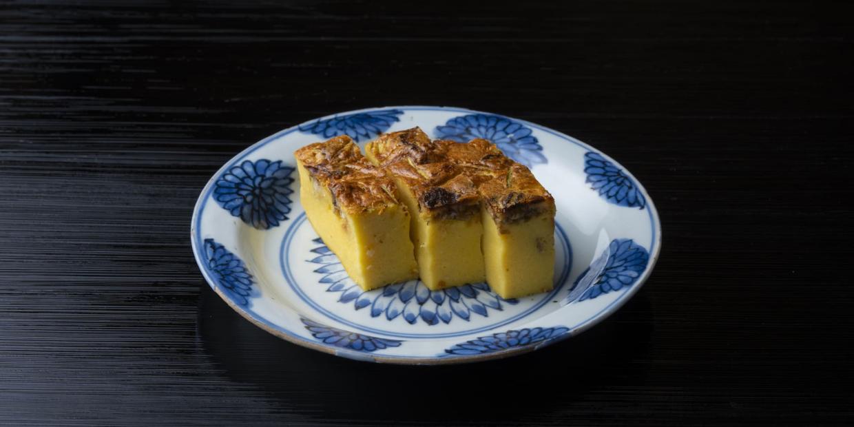『瓢亭』15代当主・髙橋義弘さんに教えていただく今回の野菜料理のテーマは、銀杏。名パイプレイヤーとして、料理の引き立て役やアクセントに使われがちですが、今回は“主役”になる2品をご紹介。まず一品目は、厚焼き玉子。庶民的にならない味付け、しっとり焼き上げる技が潜んでいます。