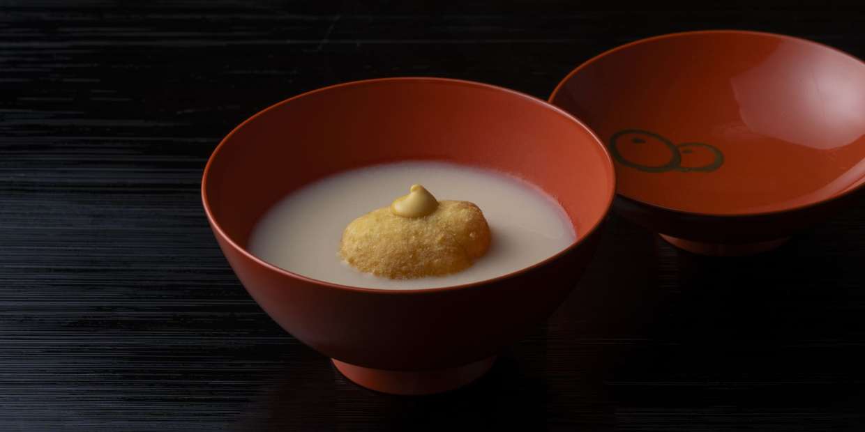 銀杏餅の白味噌椀——銀杏生地は2度蒸ししてもっちり食感に